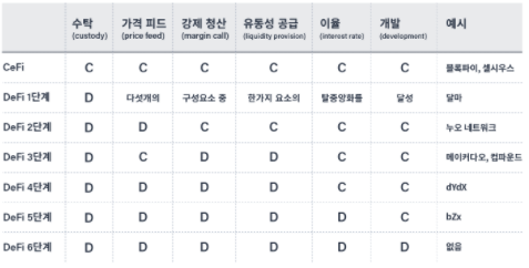 - 해당 분류 체계에서는 수탁, 가격 피드, 강제 청산, 유동성 공급, 이율, 개발 등 총 6가지의 부분을 기준으로 분류