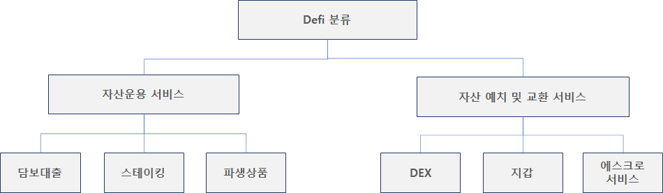 - 암호자산 기반의 금융상품을 분산화된 시스템 위에 설계하고, 금융기관의 역할을 스마트 컨트랙트와 블록체인 기술을 활용하여 구현한 탈중앙화 분산 금융