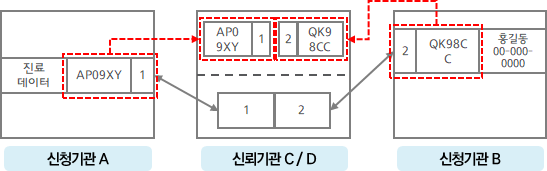 | - 단일 코딩 방식을 변형한 방식으로 결합키를 생성한 신청기관 중 한 곳의 결합키에서 파생된 추가 대체키를 생성한 후 ,결합키와 추가 대체키를 가진 별도 데이터를 만들어 결합하는 방식 - 데이터를 결합하려는 신청기관간 직접적인 연결고리를 제거해 안전한 데이터 결합환경 제공 |