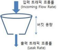 - 인입 트래픽 버킷에 저장 - 버킷 속도 평준화 - 버킷 과도 시 폐기 - 트래픽 성형 기술의 대표적 알고리즘 - 버스트 트래픽을 고정 데이터율 트래픽 으로 조정 (항상 일정량) -속도제어를 통해 트래픽양의 버킷을 허용하면서 조절한 후, 용량제어를 이용해서 특정 한계치의 값 만큼 일정하게 트래픽을 전송하는 복합 장식 구성 가능 |