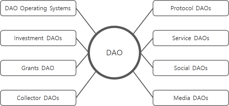 - 2016년 첫번째 DAO인 이더리움 발전용 DAO "The DAO" 탄생이후 다양한 유형의 DAO 탄생