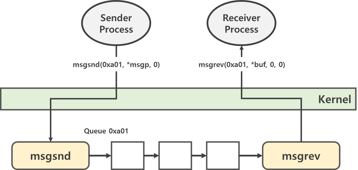 | 정의 | - OS의 제어를 통해 커널 내 Message Queue를 이용하여 프로세스간 메시지를 전달하는 단 방향 통신 기법 | ||