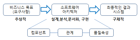 - 소프트웨어를 구성하는 컴포넌트와 컴포넌트의 관계를 추상적인 수준에서 정의하여 시스템 설계와 개발 시 적용되는 원칙과 지침을 제공하는 시스템 구조