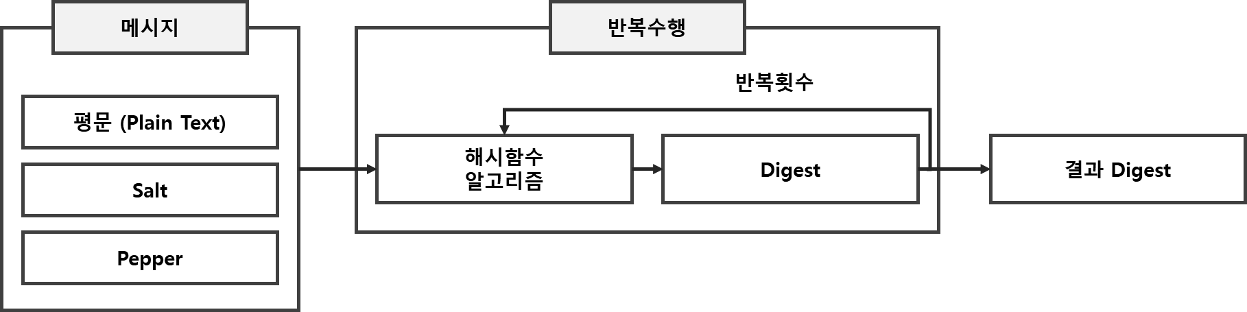 N 번이상 반복하여 다이제스트를 생성함으로써 해시함수의 취약점을 보완하는 기법