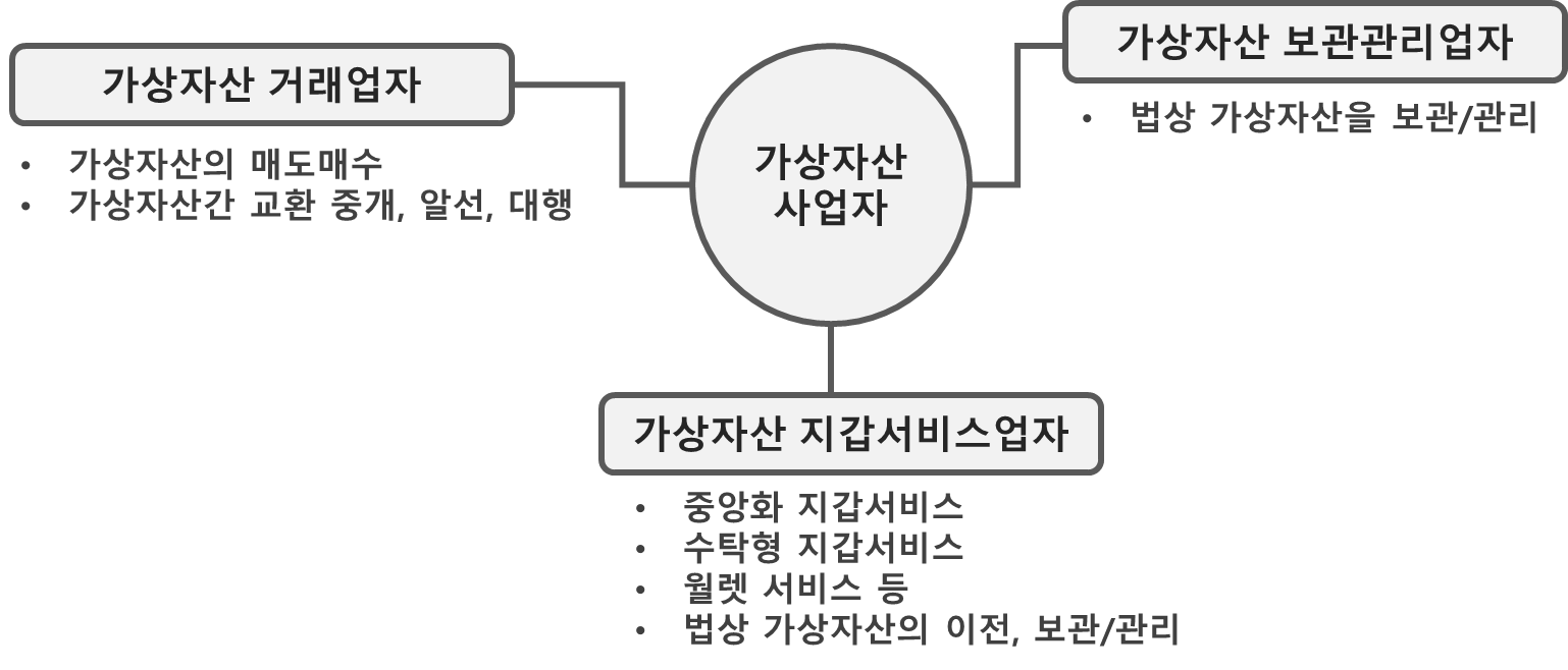| 가장자산 지갑서비스업자 | 주요활동 | - 가상자산의 보관ㆍ관리 및 이전 서비스 등을 제공하는 사업자로 중앙화 지갑서비스, 수탁형 지갑서비스, 월렛 서비스 등으로 통용 - 법상 가상자산의 이전, 가상자산의 보관ㆍ관리 행위를 주요 업무로 수행 |