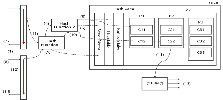 | (1) 통계정보를 참조하여 보다 효과적인 카디널리티를 갖는 집합을 빌드입력으로 선택 (2) 팬아웃, 즉 파티션 수를 결정 (3) 빌드입력이 조인키에 대하여 1차 해쉬함수를 적용하여 저장할 파티션 결정 (4) 2차 해쉬함수를 적용하여 해쉬값 (Hash Value)를 생성 (5) 해쉬값을 이용하여 해쉬 테이블을 만들고 해당 파티션의 슬롯에 저장 (6) 검색입력의 필터링을 위해 사용할 비트맵 벡터 생성 (7) 빌드입력의 처리범위를 모두 처리할 때까지 반복수행 (8) 검색입력의 처리범위를 액세스하기 시작하여 조건을 만족하지 않으면 버리고 그렇지 않으면 다음을 실행 (9) 첫번째 해쉬함수를 적용하여 비트맵 벡터를 필터링, 여기서 찾을 수 없으면 해당 처리는 종료되고 다음 검색입력 대상으로 이동 (10) 필터링을 통과한 것은 2차 해쉬함수를 적용하여 해쉬 테이블을 읽고 해당 파티션을 찾아 슬롯에서 대응로우 검색 (11) 조인이 되면 SELECT-List에 기술된 로우를 완성하여 운반단위에 저장 (12) 이러한 작업을 반복해서 수행하여 계속 운반단위에 저장 (13) 정해진 운반단위가 채워지면 리턴 (14) 이러한 방식으로 검색입력이 처리범위가 끝날 때까지 반복 수행 |