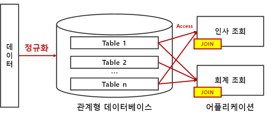 | - 관계형 데이터베이스에서는 정규화를 강조하기 때문에 관리하고자 하는 정보가 필연적으로 다양한 테이블에 나누어져 저장되고 테이블 간에는 관계를 갖고 있으며 이렇게 저장된 데이터를 다시 결합하여 액세스 하기 위한 방법으로 조인 기술 사용 |