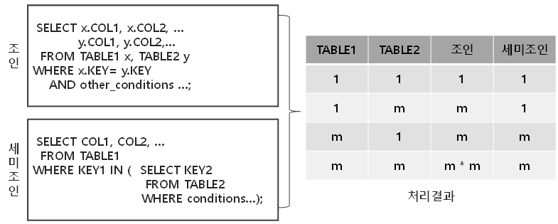 | Sort Merge형 세미조인 | - 연결고리의 이상이 발생하거나 대량의 데이터를 연결해야 할 때는 세미 조인에서도 SortMerge형 조인을 적용 - SortMerge 형태로 수행해야하는 이유와 효과는 조인과 거의 동일 |