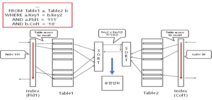 | 스캔방식 | - 각자의 처리범위를 줄이기 위해서 인덱스를 사용하는 경우만 랜덤 액세스가 발생할 수 있으나 연결하는 머지 작업은 스캔 방식 이용 | |