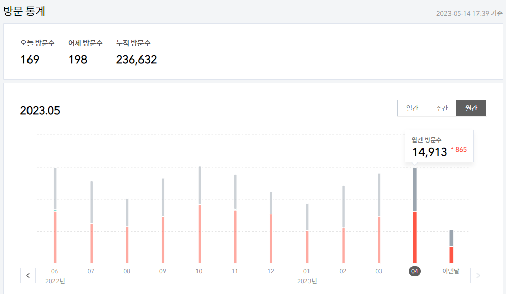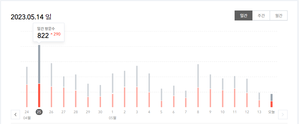 꾸준히 매월 방문수 1만건이상 나오고 있습니다. 일간 최대 방문수는 4월 25일 822건 이네요.