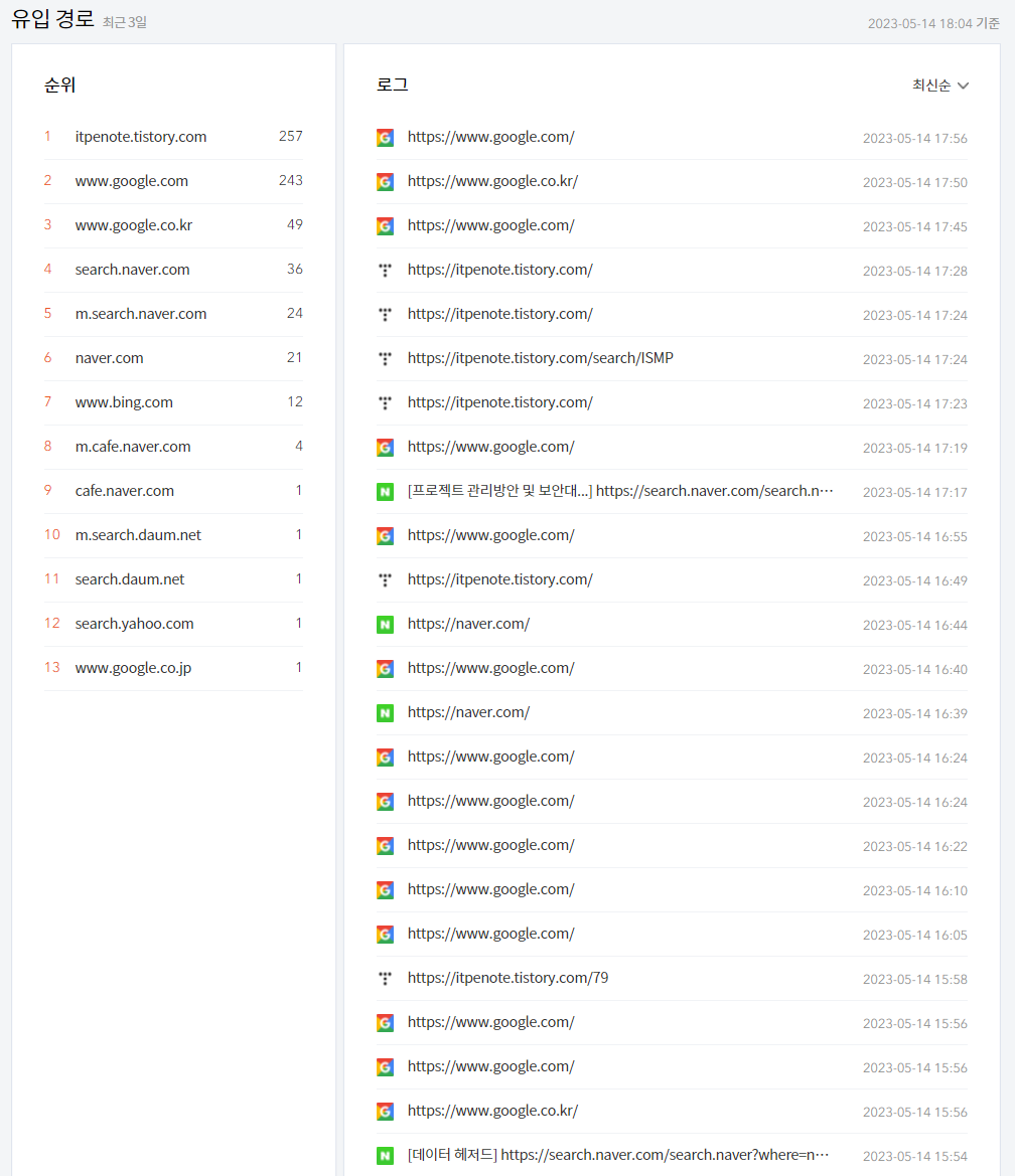 그나마 최근에는 제 블로그 글을 참조한 네이버 블로그 글을 통해 조금 유입되는 것 같더라고요.