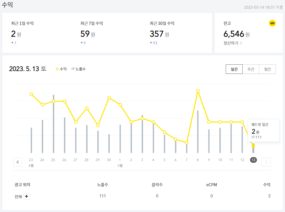 카카오 애드핏을 통해 6,546원을 벌었습니다.