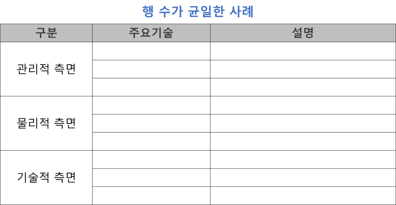 또한 가능하다면 각 구분 항목의 행 수를 동일하게 맞추어 주시면 표가 더 균형감 있게 보일 것입니다.
