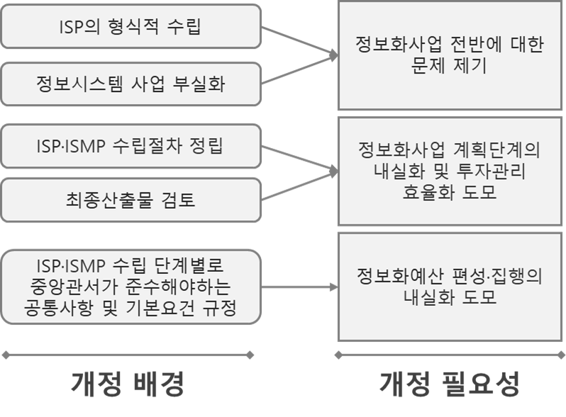 | 2 | 수립제외 | - ISP·ISMP 수립제외 유형 제시 | - 유형별 세부 사례 추가 | - 빈번한 문의사항에 대한 설명 명확화 |