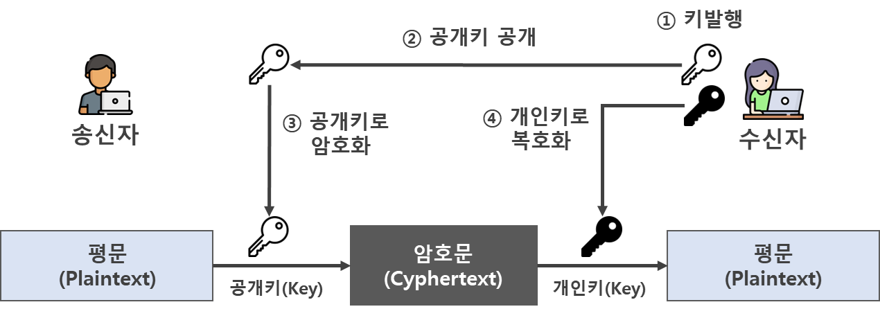 | 복호화 | 수신자에게 암호문이 전송되면 개인키를 이용하여 암호문을 복호화한다. |