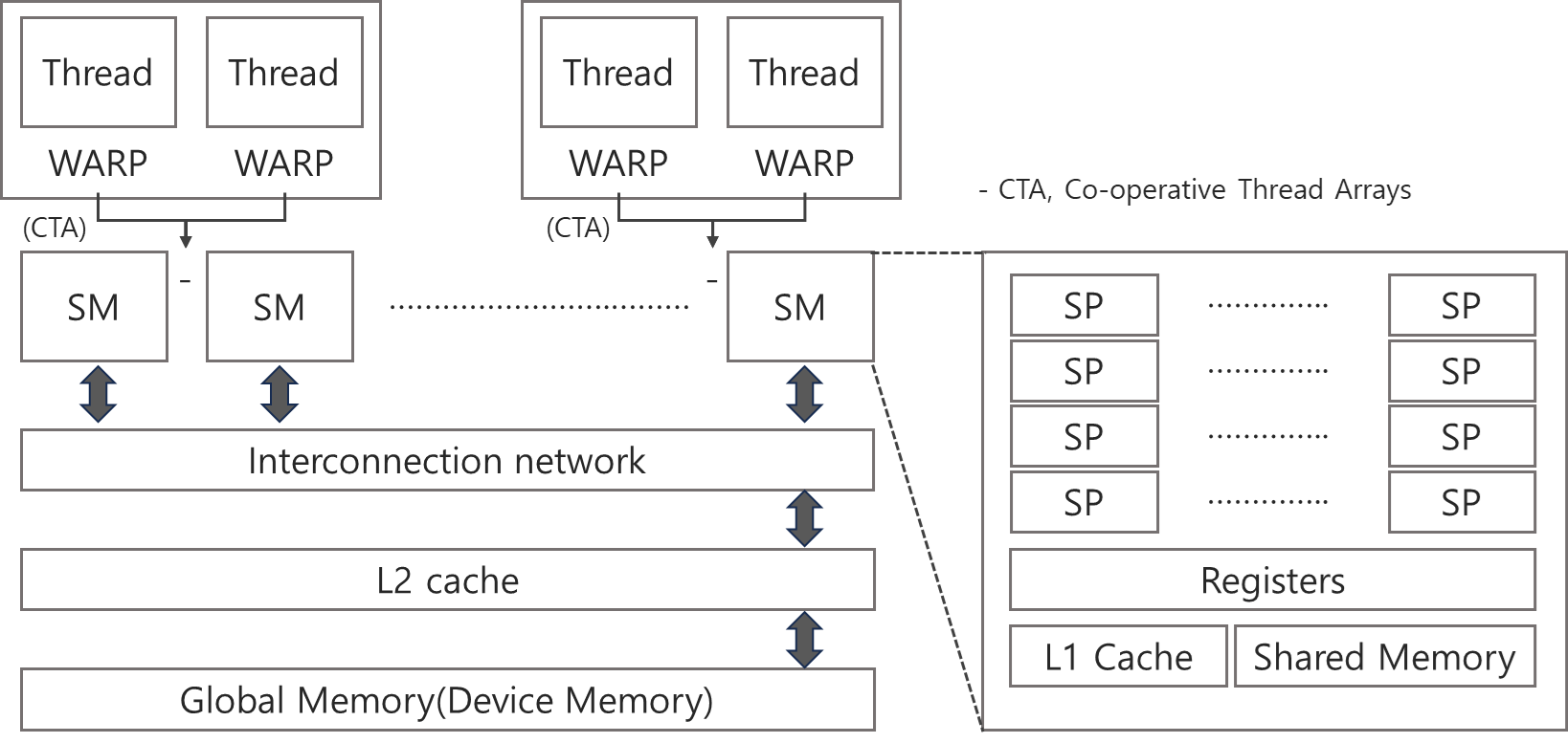 - GPGPU 아키텍처는 여러개의 SM들로 구성되며, SM은 여러개의 SP로 구성