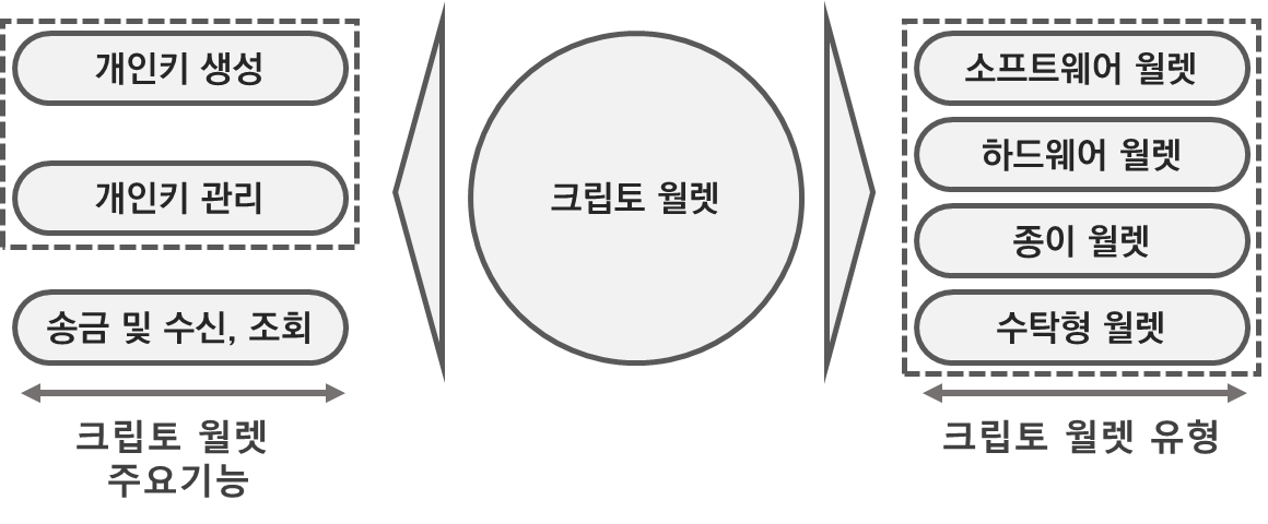 | 크립토 월렛 개념 | - 사용자에게 개인키와 주소를 생성하거나 복구하고 거래내역을 작성하며, 개인키를 이용하여 거래에 대한 전자서명을 하는 서비스를 제공하는 소프트웨어 |