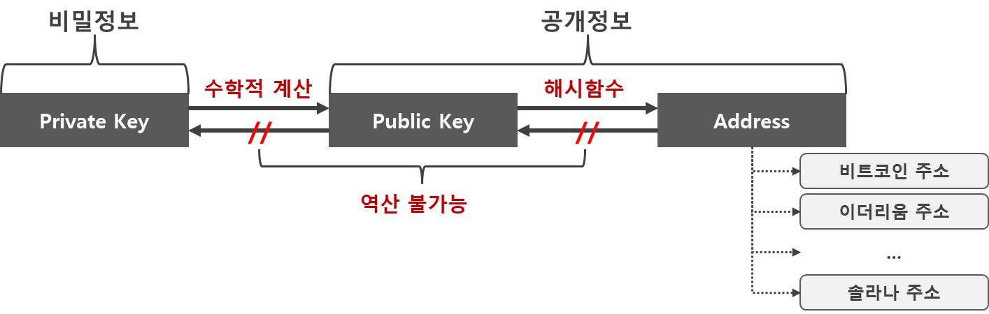 - 개인키 > 공개키 > 주소가 생성되는 모든 계산은 일방향인 특성이 있어 역산이 거의 불가능