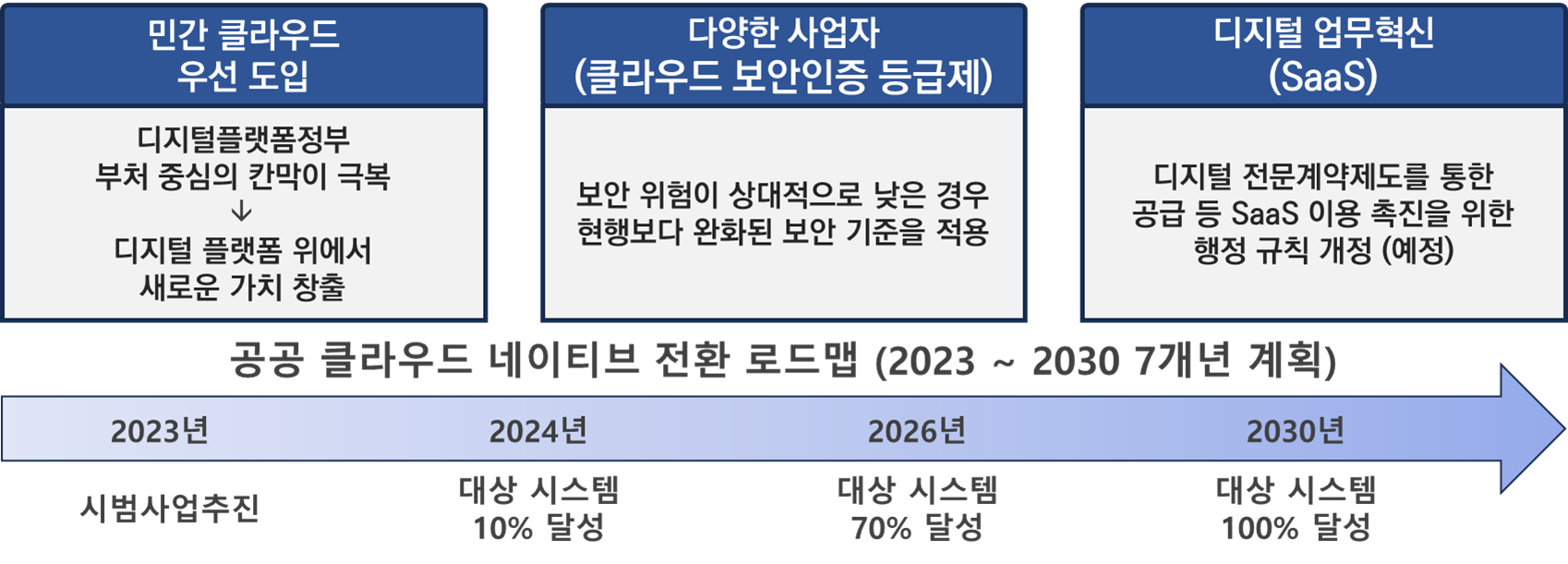 - 클라우드 환경 아래 공공부문의 디지털 혁신 기반 조성 및 정부 서비스의 안정성과 신속성을 제고하기 위해 행정안전부 및 디지털플랫폼위원회에서 전환 로드맵을 수립하고 클라우드 네이티브 우선적용 원칙을 규정