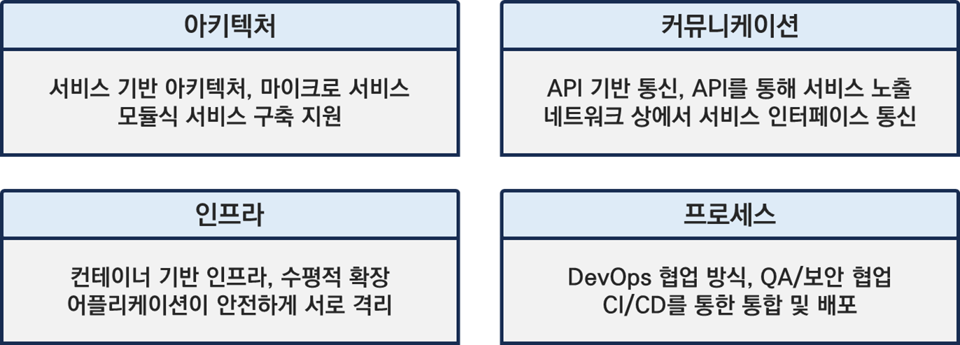 - 클라우드 네이티브는 클라우드 성숙도 최고 단계로 MSA, 컨테이너 등 4가지 핵심 구성요소를 기반으로 클라우드에 최적화된 시스템 구현