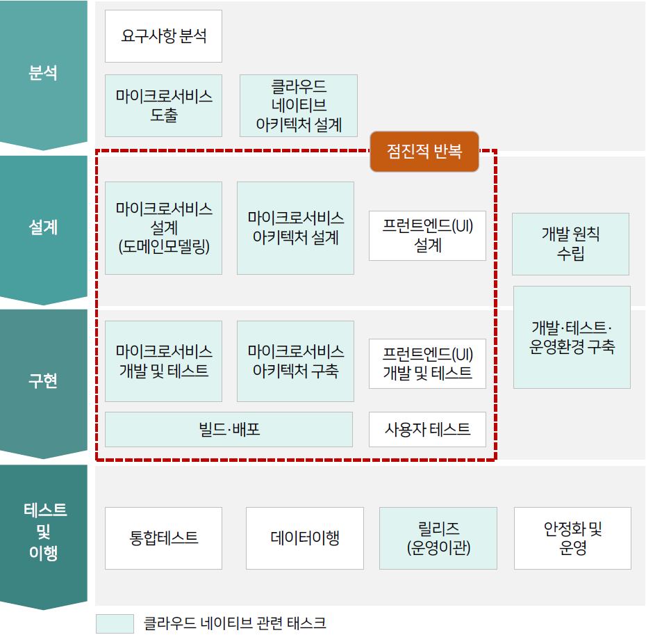 | 개요 | - 클라우드 네이티브 정보시스템 개발 절차는 분석, 설계, 구현, 테스트 및 이행의 단계로 진행된다 요구사항이 명확한 대부분의 공공 정보화사업은 폭포수 방법론에 따라 수행하고, 새로운 서비스를 구현하는 경우에는 애자일 방법론에 따라 점진적이고 반복적으로 수행하는 절차 |