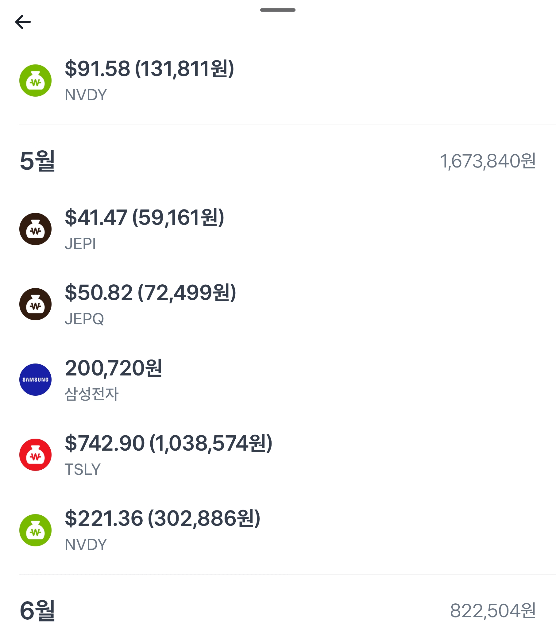 KB 계정(배우자)은 월 100만원 배당이 나오려면 멀었기 때문에 토스 계정에서 나오는 배당금과 추가로 수입이 생기면 TSLY를 계속 매수할 계획입니다.